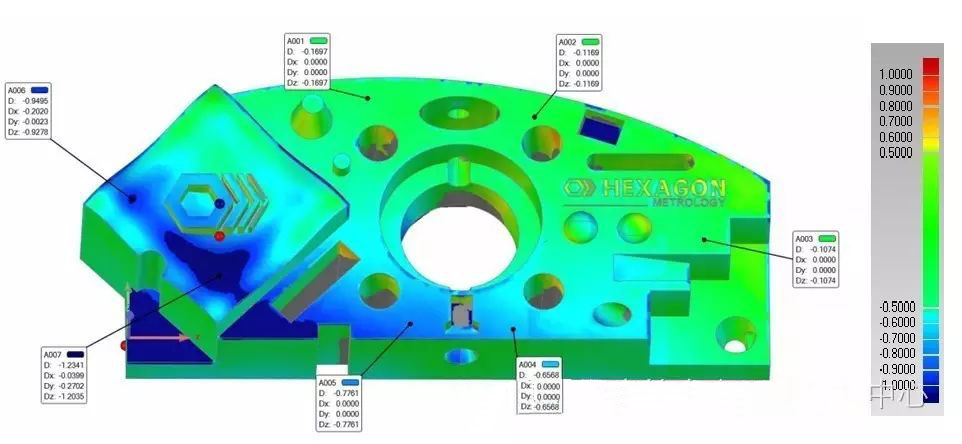 通過點云色差圖反應(yīng)工件全曲面的尺寸形貌。如下圖所示,綠色代表合格區(qū)域,藍色代表負向超差范圍,紅色代表正向超差范圍;同時,也可以出具單個幾何量特征的尺寸信息。