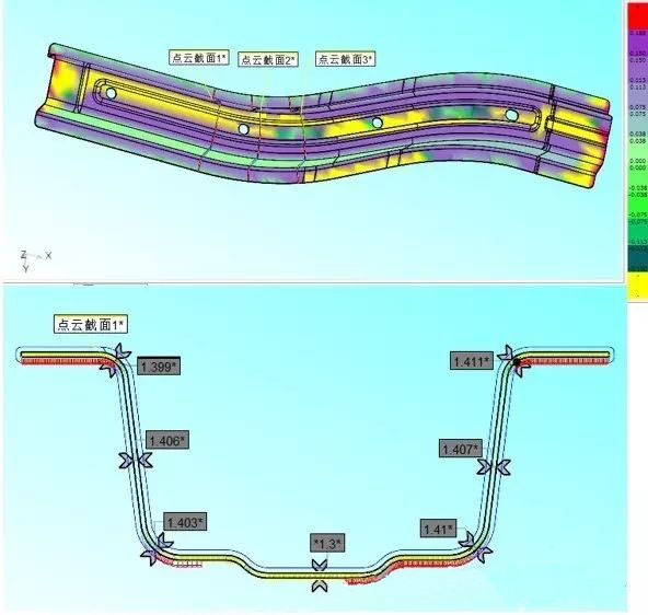 首先,掃描工件內(nèi)外兩側(cè)表面,獲得兩側(cè)表面的點云數(shù)據(jù)。其次,創(chuàng)建點云的二維橫截面;第三,評價截面線距離,求得工件壁厚,全方位監(jiān)管工件壁厚。