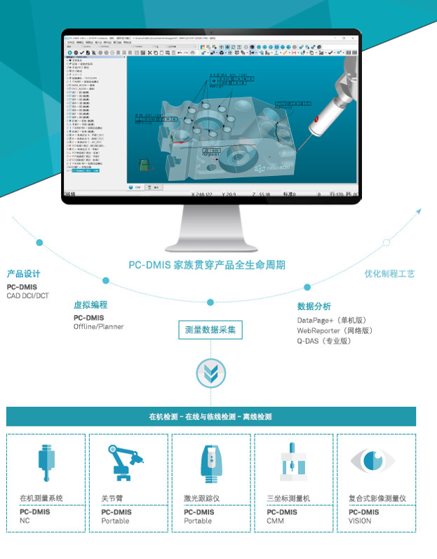 同時(shí),也要考慮該方案涉及的質(zhì)量控制在整個(gè)產(chǎn)品生命周期方面的全局發(fā)展,如,是否可以與其他質(zhì)控階段的制造和測(cè)量方案進(jìn)行緊密銜接(考慮測(cè)量軟件的兼容能力,如下圖,PC-DMIS具有廣泛的兼容能力),是否可以與其他CAD\CAM\MES\ERP等系統(tǒng)進(jìn)行連接,是否要搭建智能質(zhì)量管控平臺(tái)等等。