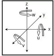 坐標(biāo)系的作用是,在測(cè)量機(jī)行程的3D空間內(nèi)定義零件位置和方向,它能具體的告訴測(cè)量機(jī)零件擺放在哪里(X/Y/Z的零點(diǎn)),是一個(gè)什么樣的角度(I/J/K矢量)。而如果零件尚沒有建立坐標(biāo)系,那么它會(huì)擁有六個(gè)自由度:旋轉(zhuǎn)的三個(gè)度(關(guān)于 X/Y/Z軸)和平移的三個(gè)度(關(guān)于X/Y/Z軸的零點(diǎn)); 如下圖所示,該圖表展示了3D空間的6個(gè)自由度(x,y,z,u,v和w)。