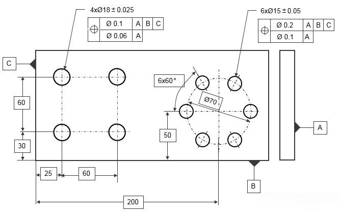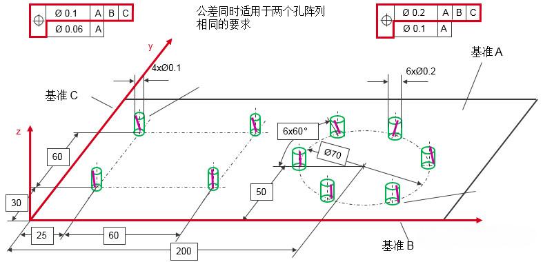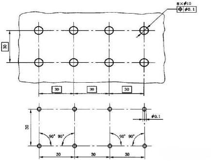 組合位置度:提供了對被測要素的多個(gè)位置度公差控制要求,同時(shí)控制了陣列要素的位置及陣列各要素的相對位置;